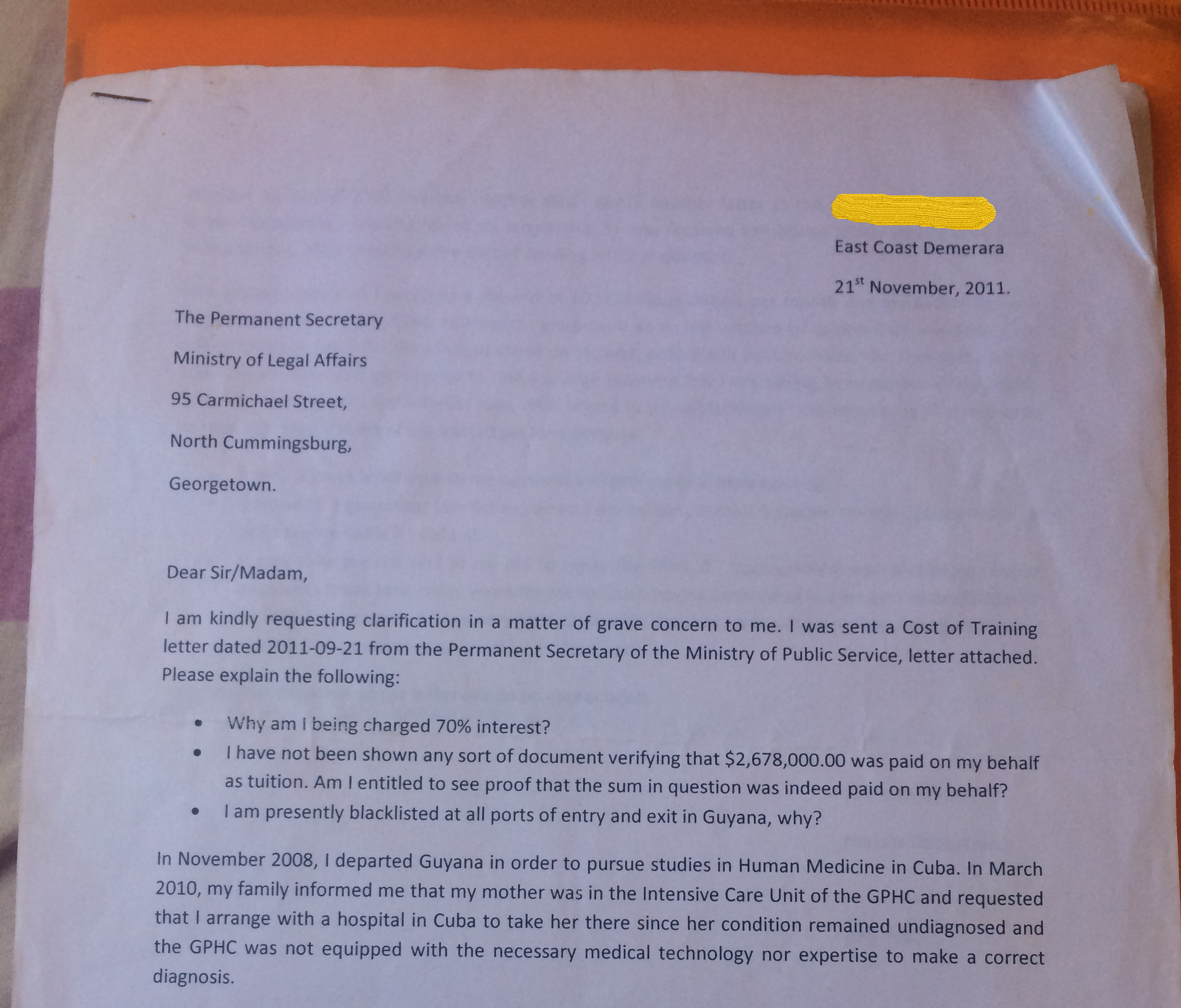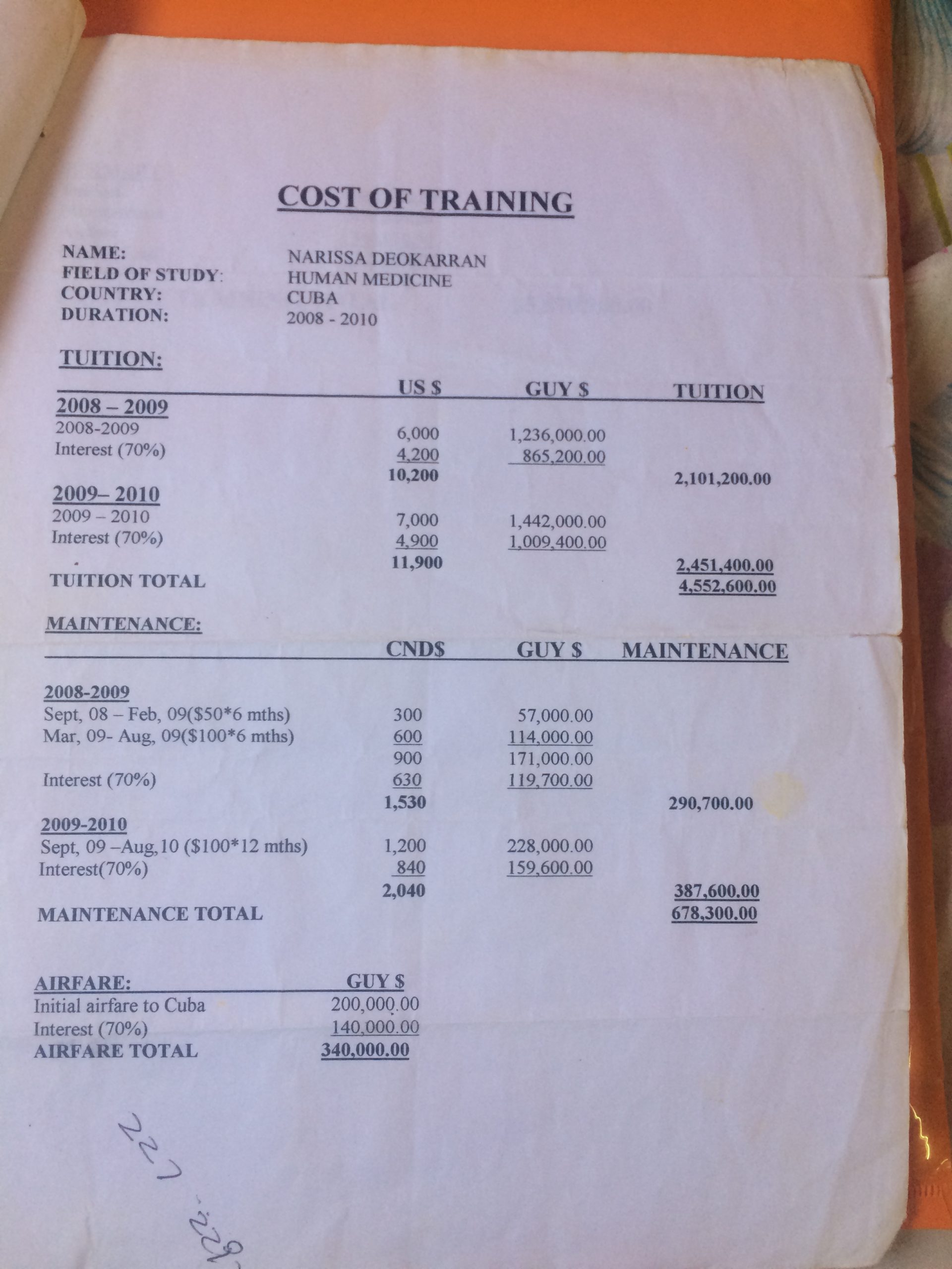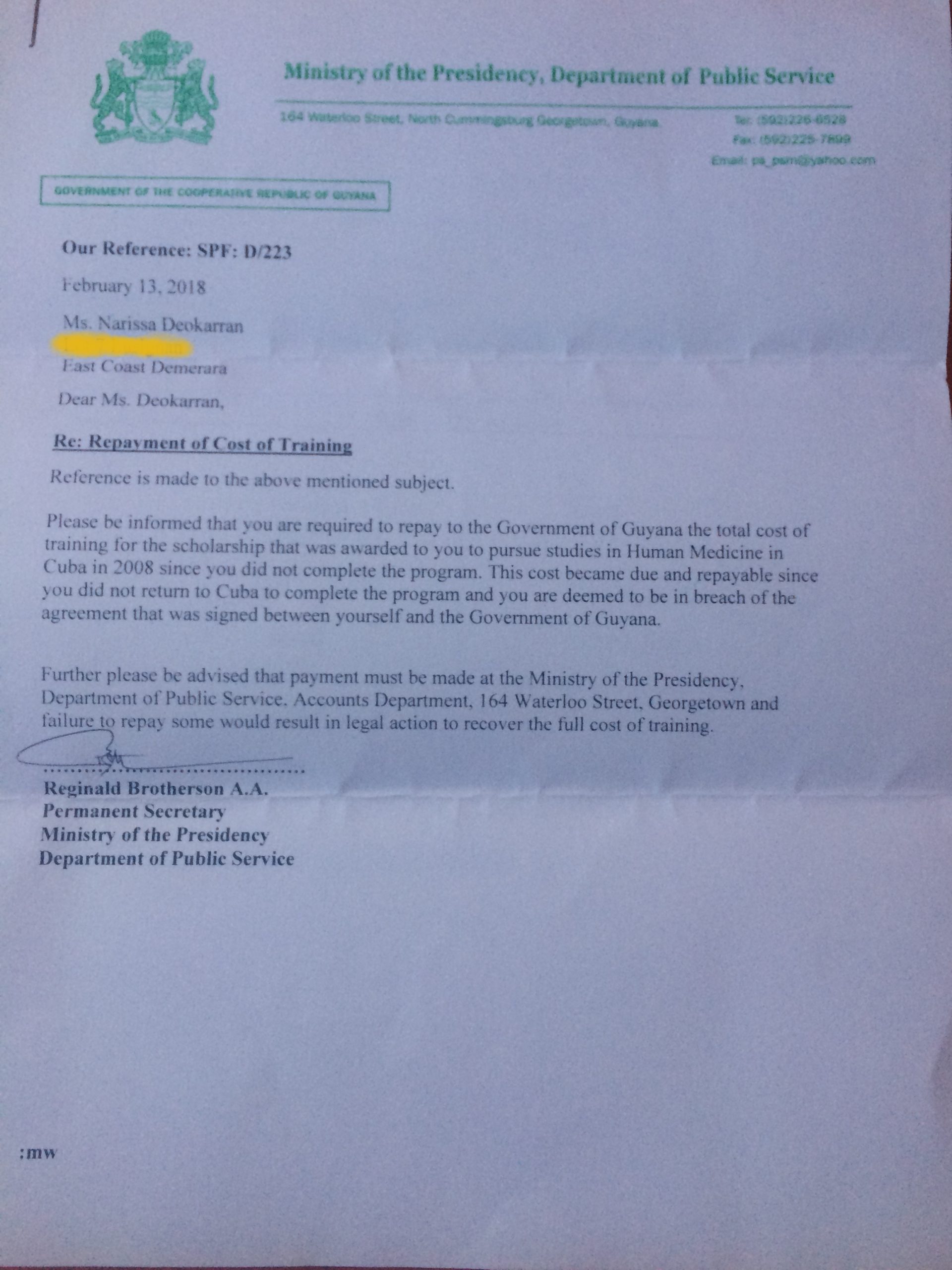 In February 2018 I received a second ‘Cost of Training’ letter from the Ministry of the Presidency (part of the letter below). It states that I am required to repay the Government of Guyana the cost of training (adjusted to 12% interest) since I did not return to Cuba to complete my studies. This is false, the PSM did not allow me to complete my studies.