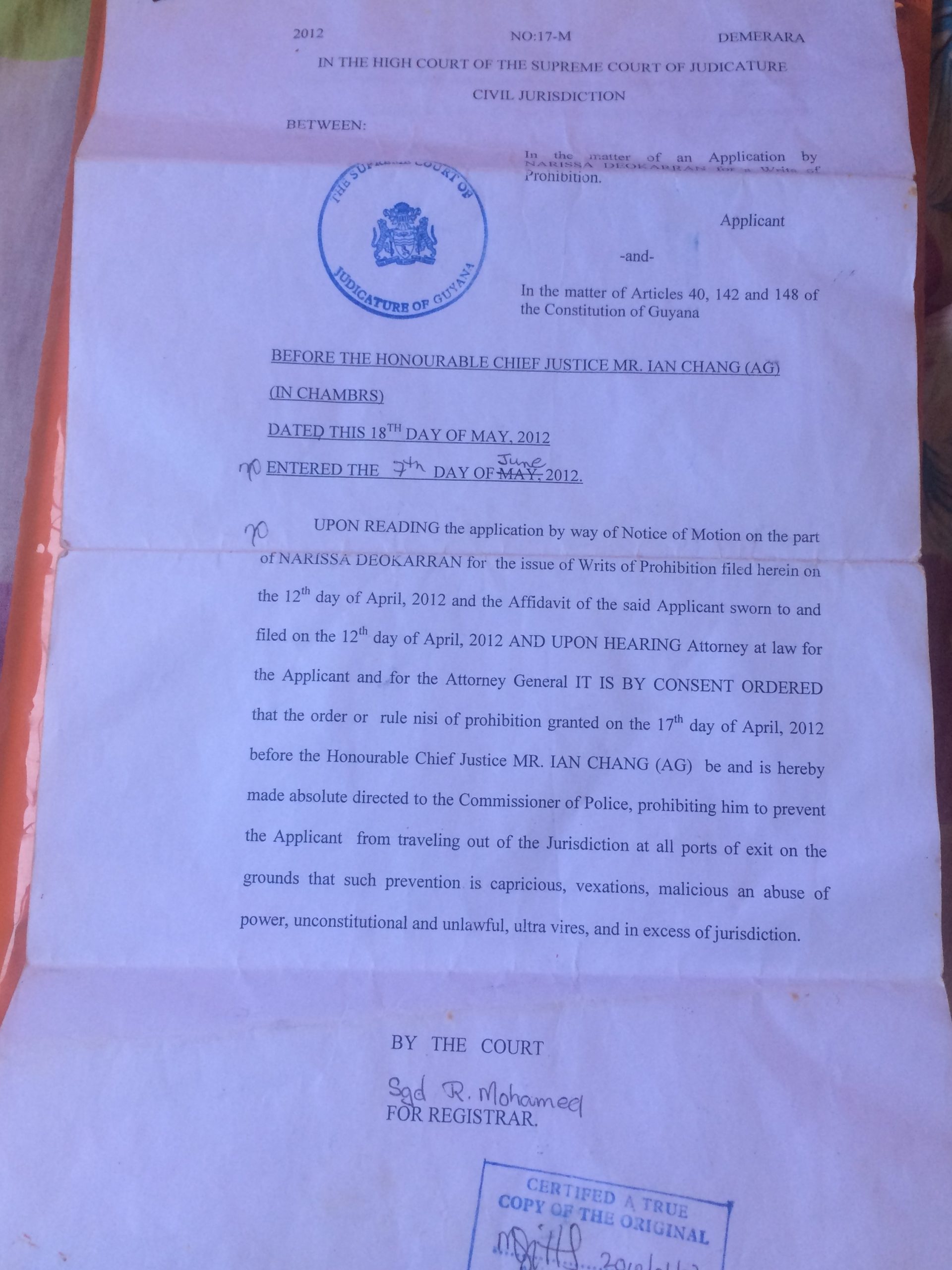 We moved to the High court; it was a constitutional case, particularly, Articles 40, 142 and 148 of the Constitution of Guyana. In June 2012 the order or rule nisi of prohibition granted to me in April was made absolute directed to the Commissioner of Police. I received no sort of compensation for my airline tickets or the cost of hiring my lawyer to obtain something for me which I should not have needed in the first place.