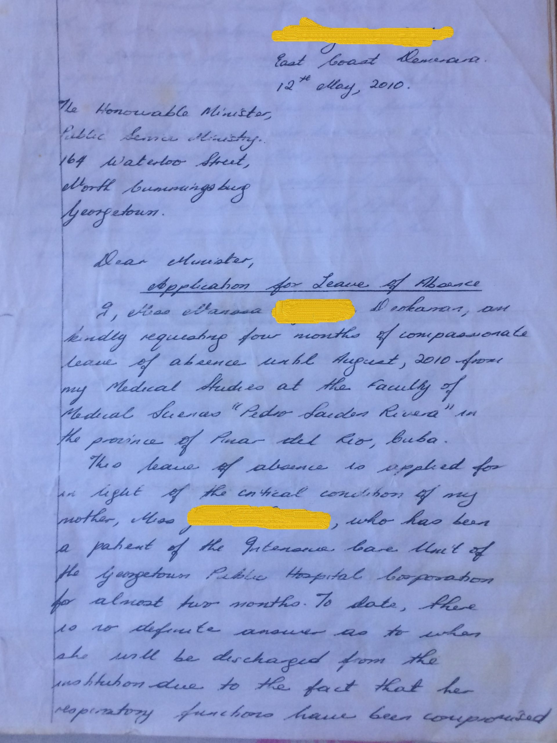 One of my friends, got me an audience with Dr. Nanda Gopaul whom I believe was an advisor to the president. After telling him my story he suggested that I write a letter to the Minister of Public Service requesting a leave of absence from my studies. When I met Dr. Gopaul it was already May and I’d missed the final examination of the second semester and the third had begun. So, I wrote a letter (part of it below) requesting leave until the end of that academic year (August) and gave it to Dr. Gopaul who promised to personally deliver it to the Minister.