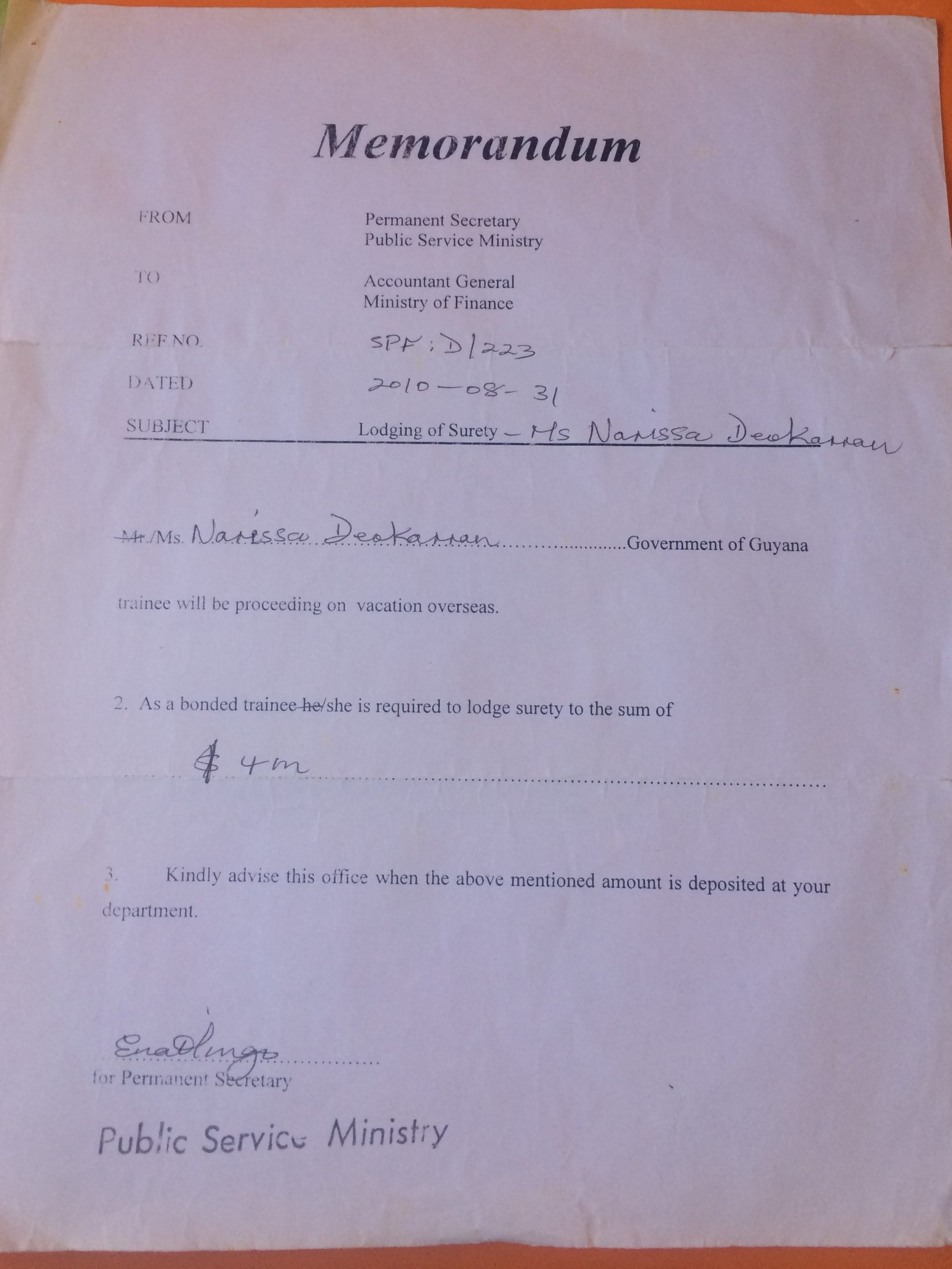 After my mother died in August 2010 I went to the Ministry of Public Service and informed the officials there that I wanted to travel to Cuba. Shockingly, I was told that I needed to lodge $4,000,000 with the Accountant General of the Ministry of Finance to leave the country as a ‘bonded trainee’ (document below).