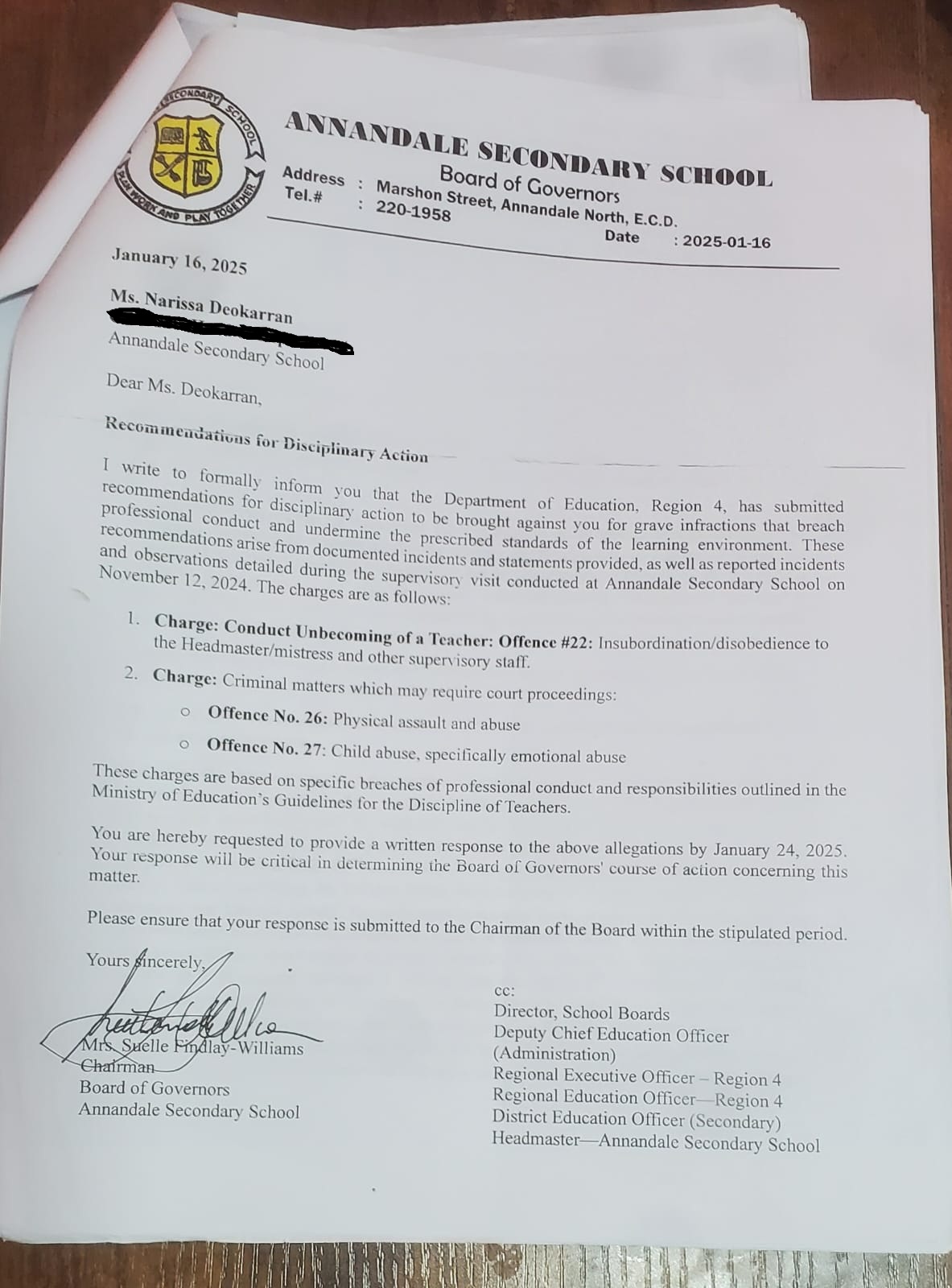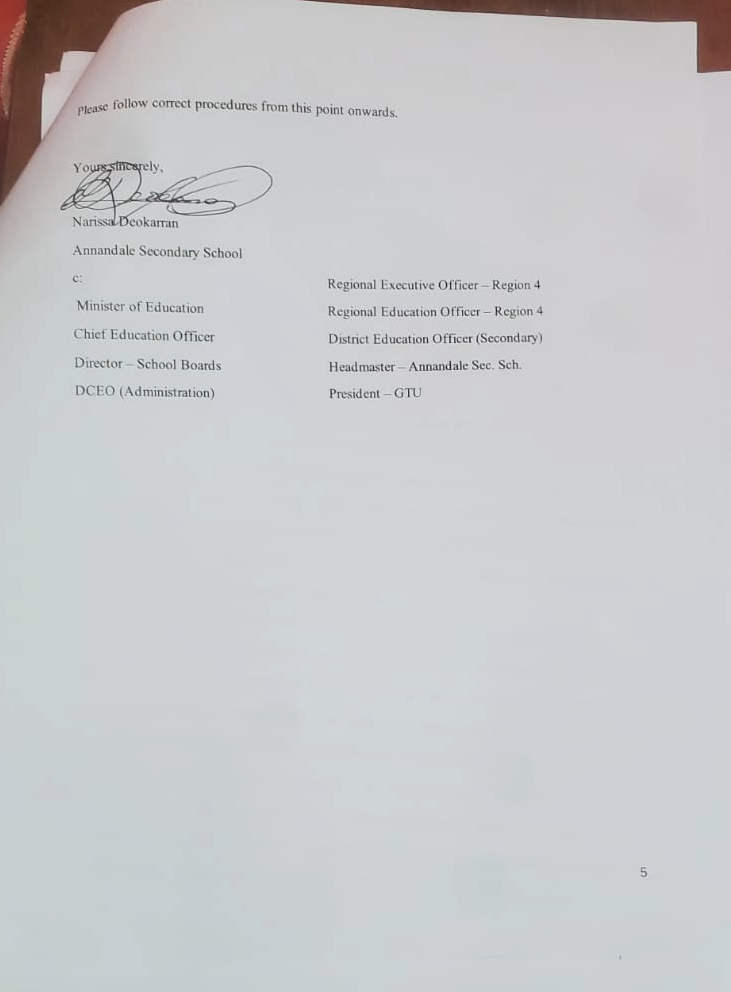 The chairperson of the Board of Governors of Annandale Secondary School officially informed me, the director of the School Board Secretariat, the DCEO (Administration), Regional Education Officer (Region 4), Regional Executive Officer (Region 4), DEO and the headteacher that it was recommended that disciplinary action be taken against me since January 2025. What is supposed to happen next? Whoever is the chairperson now needs to issue another official letter to all parties on this matter. They either have a case against me or not. If I was wrongfully accused and there is no evidence to substantiate the allegations, then an official apology is required and this should be sent to all parties; this is the very least. If I were guilty would these people be dragging their feet like this?