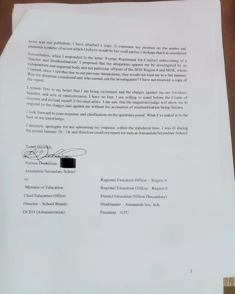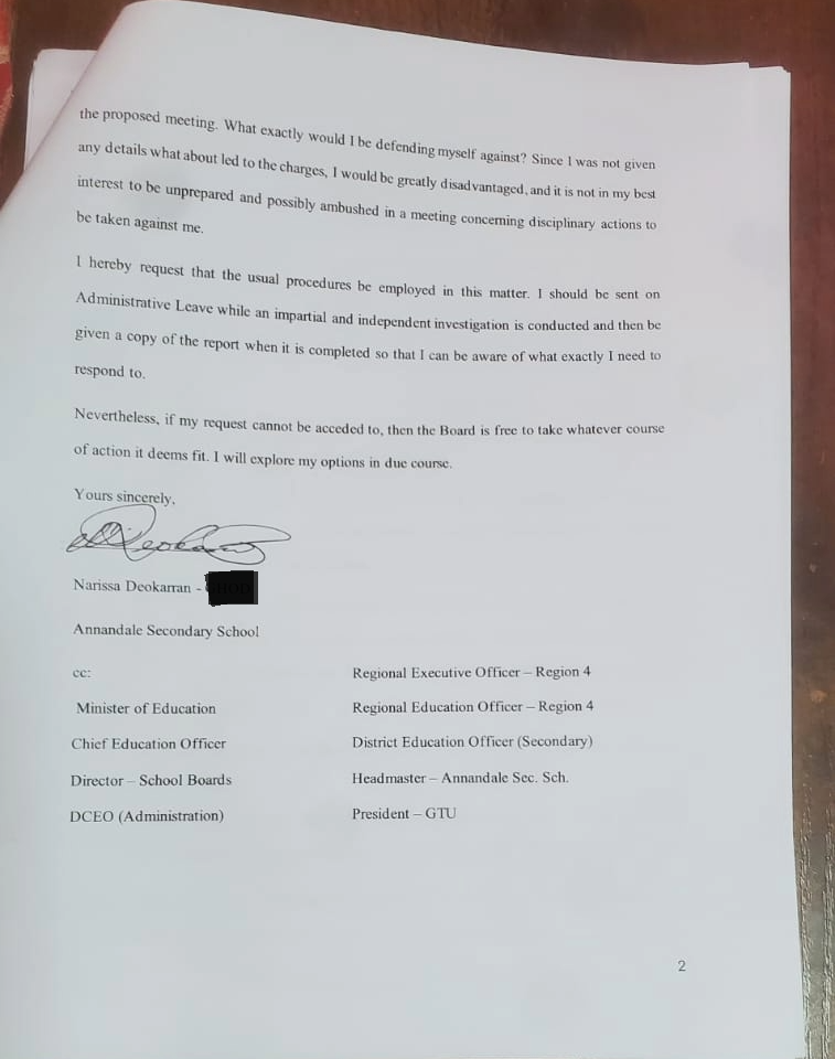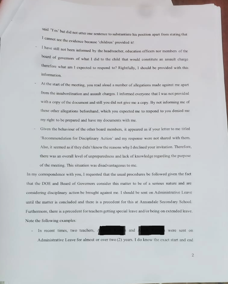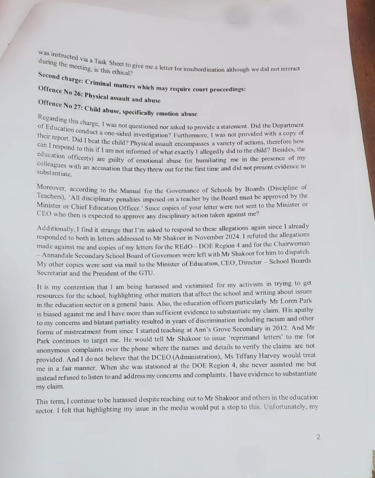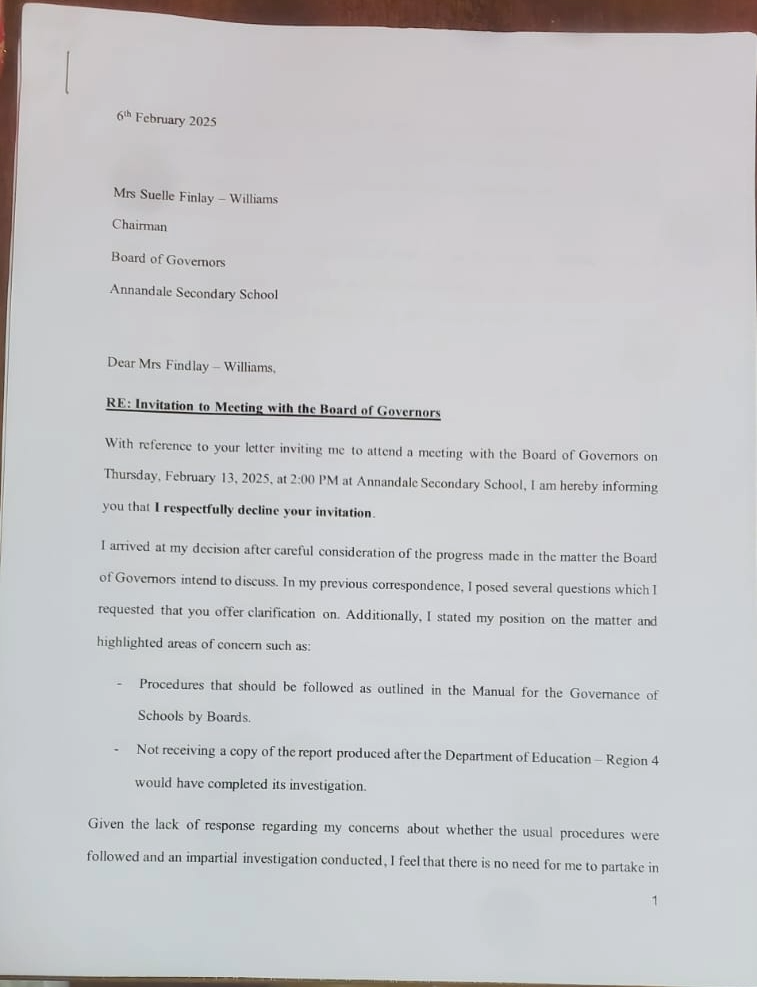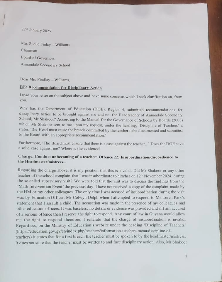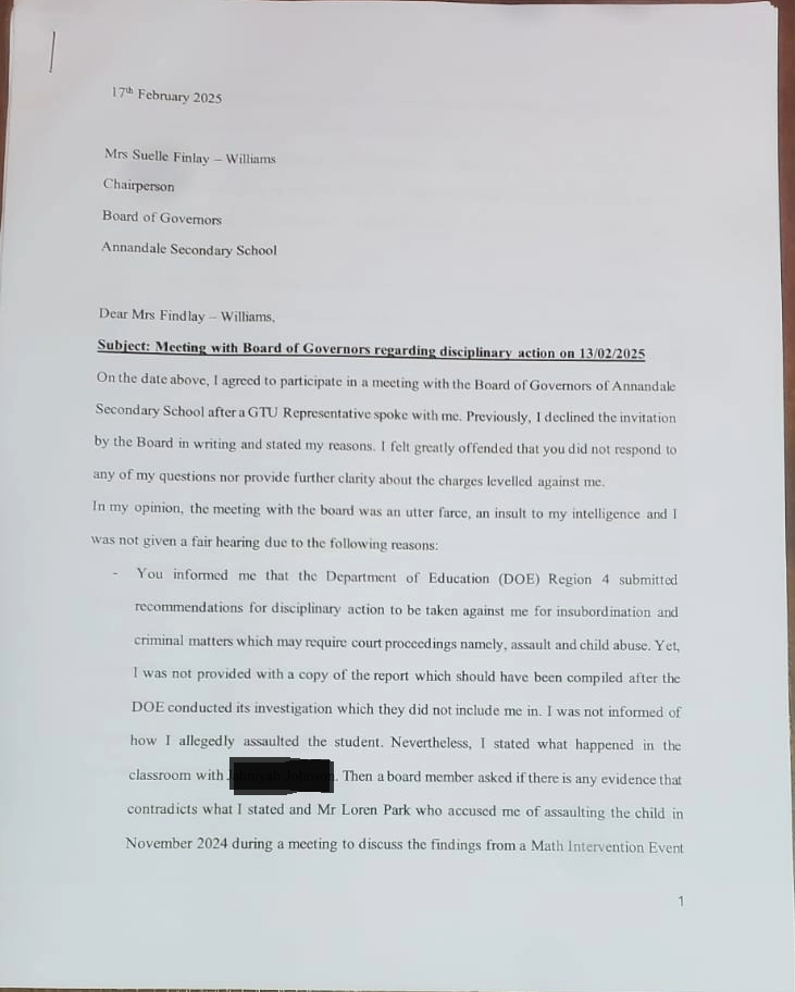Then in January 2025, I received a letter from the Chairperson of the Board of Governors of Annandale Secondary School. I replied to the letter and sent copies to everyone the chairperson had sent her copies to. However, I included the Minister of Education, Chief Education Officer and GTU. I pointed out certain inaccuracies in her letter including the fact that the headteacher nor my colleagues accused me of insubordination during the Math Intervention meeting. It was Mr Colwyn Delph, an education officer when I tried to respond to the accusation levelled by Loren Park. And I was never shown any evidence/documentation or statement ‘documented’ or otherwise regarding the matter by the relevant education officers nor was I told of exactly what I’d been accused of. For instance, was it alleged that I hit the child, slap her or what?