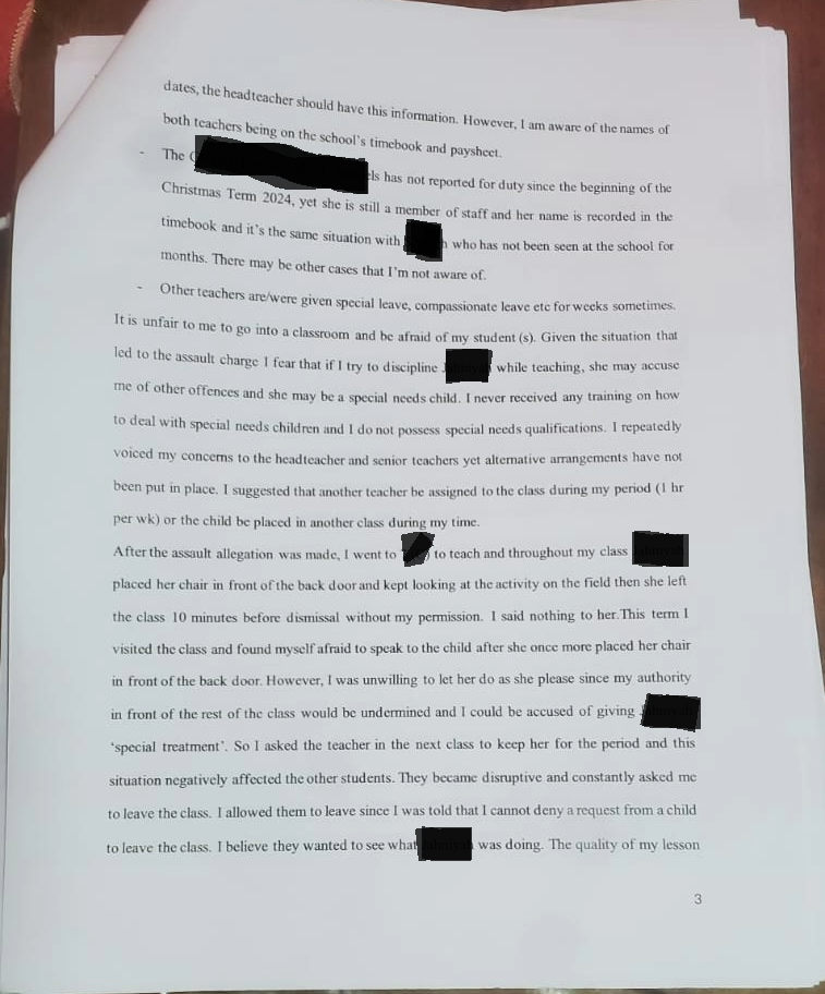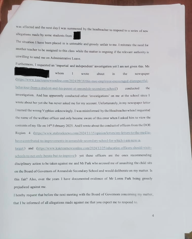 The headteacher has a file for each teacher in the school. At the meeting with the Board of Governors, I was told that the headteacher should give me access to it. When I given access in February 2025, I was taken aback. My file contained documents with allegations against me that I was never shown or given copies of, thereby denying me my right to respond. And many of these were from anonymous persons. For instance, some ‘students’ from a Grade 8 class were apparently asked to write notes about me which were then placed in the file without my knowledge. This stemmed from a minor incident which occurred in their class and the request for notes from the children criticising me by either the headteacher or educational officers was very unprofessional, unethical, a smear campaign and ‘vengeful’. A boy mocked me during the lesson and I complained to the HM about his behaviour which disrupted my class. Instead of a simple apology from him, his relative who works/worked at the MoE got involved. I wrote about the matter after: https://kaieteurnewsonline.com/2024/09/18/this-moe-employee-encouraged-disrespectful-behaviour-from-a-student-and-his-parent-at-annandale-secondary-school/