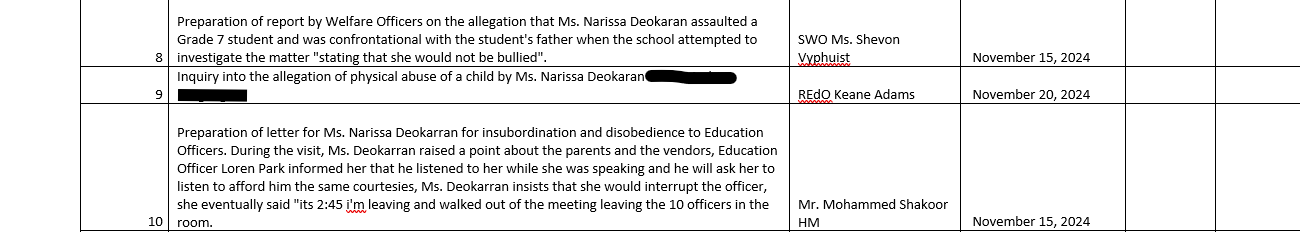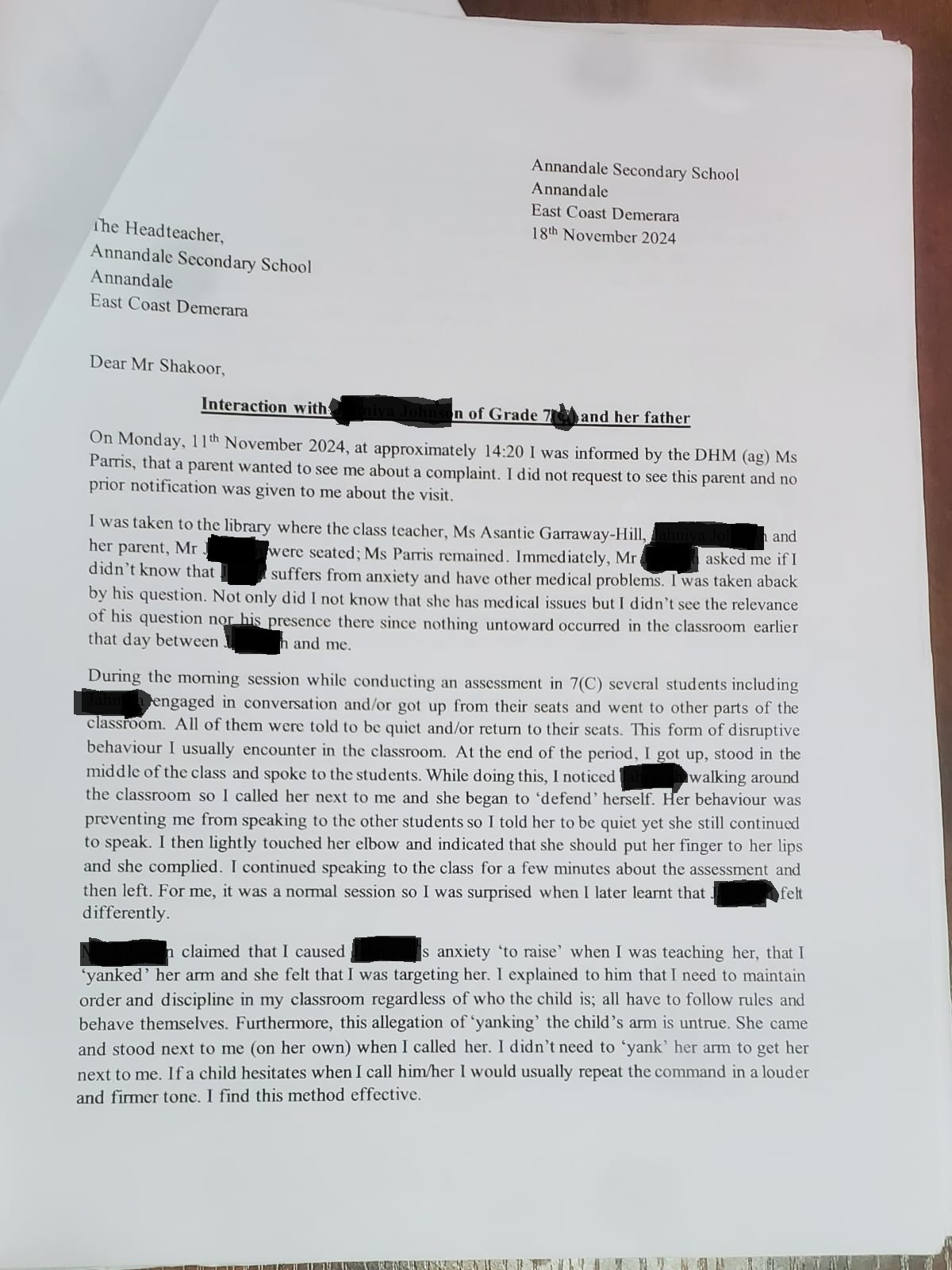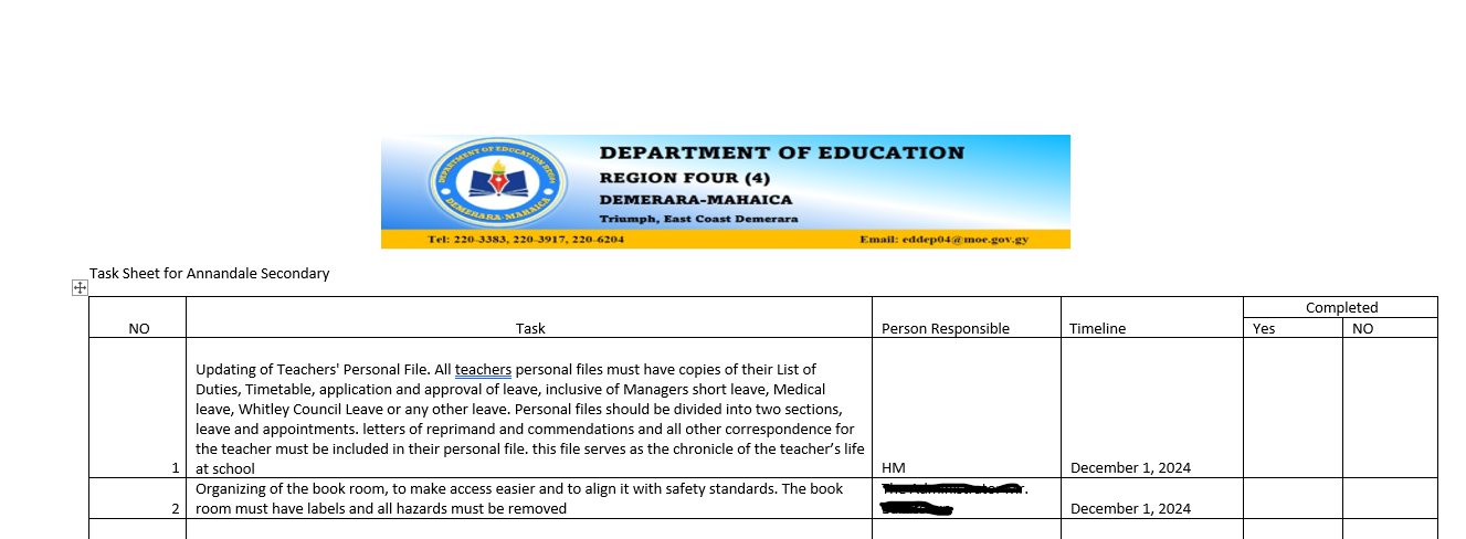 Also, as stated on the task sheet, the Regional Education Officer, Ms Keane Adams was supposed to hold an inquiry into the allegation on 20th November 2024, I was never invited to be a part of this nor was I asked to submit a statement/report. I don’t know if the scheduled inquiry occurred. In an effort to get my side out, I wrote about the matter in the Stabroek Newspapers: https://www.stabroeknews.com/2024/11/15/opinion/letters/my-letters-to-the-media-have-contributed-to-improvements-in-annandale-secondary-school-for-which-i-am-now-a-target/. Still, there was no response from anyone and I did not receive guidance from the HM, DHM or other senior teachers on what to do or how to interact with the involved child. And there was no feedback on the matter; whether it was still being investigated or not.